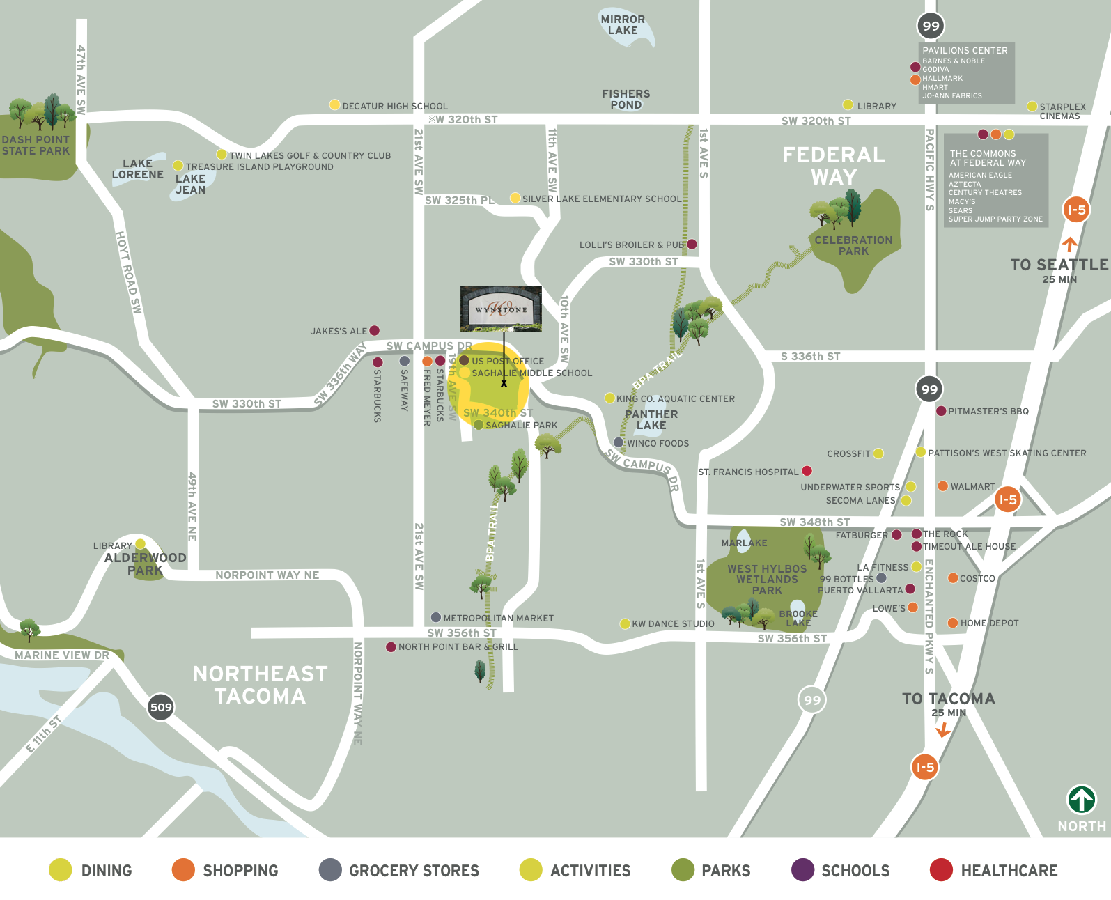 Wynstone is located in the desirable West Campus area of Federal Way, Washington. It is conveniently located just minutes to major shopping and entertainment. Adjacent to the BPA pedestrian walking trail, it is surrounded by open spaces, public trails and parks and just a short walk to the King County Aquatic Center. This location is a commuters dream; easy access to I-5, Joint Base Lewis-McChord, and Seattle - only 30 minutes away.